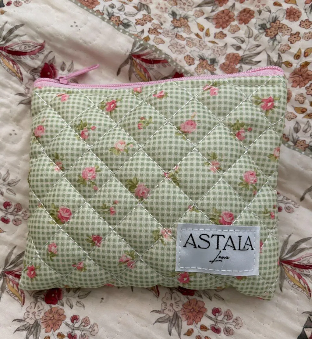 Fawn Pouch is a green gingham rose print, featuring a pink gingham inner lining, rose detailing and outer quilting.