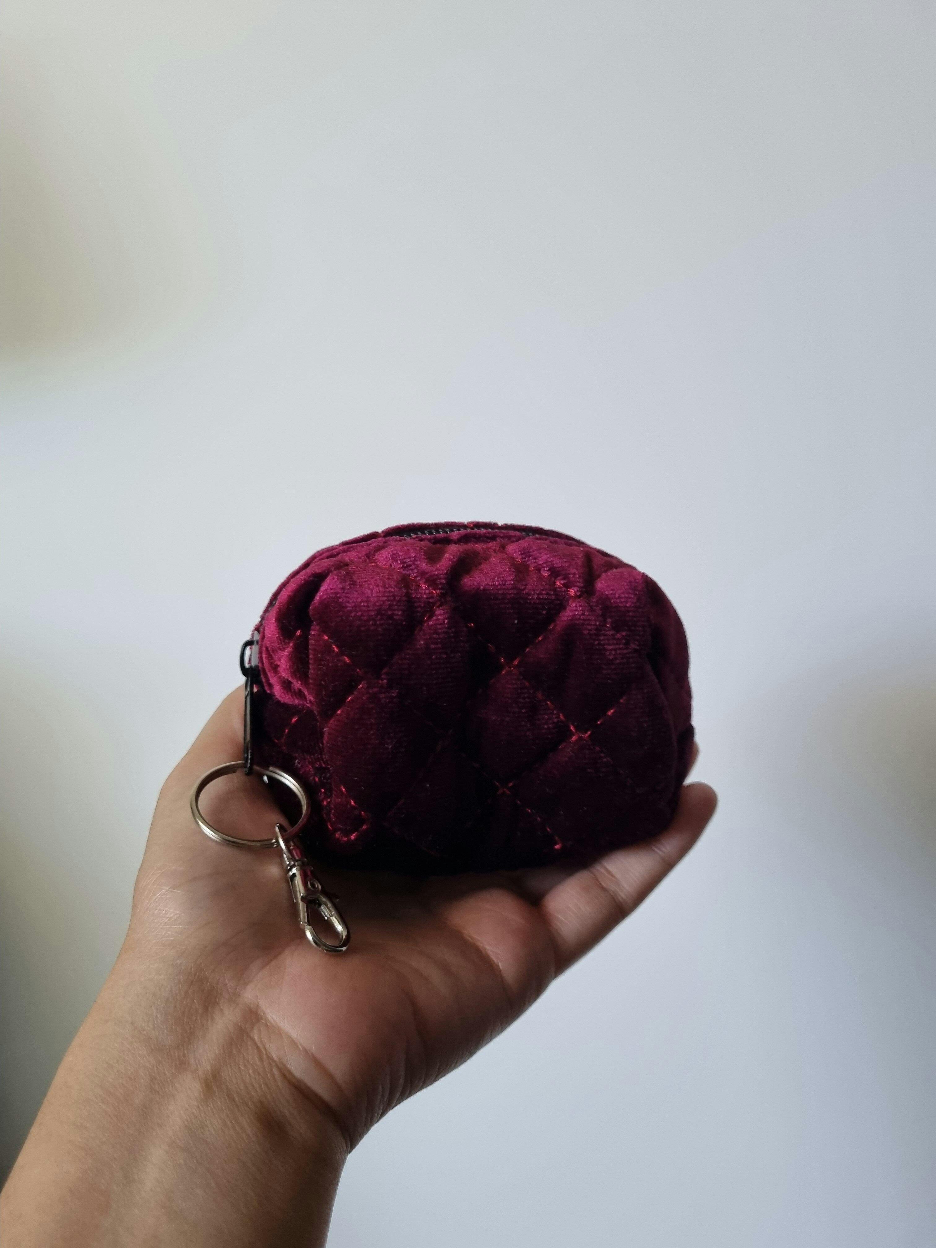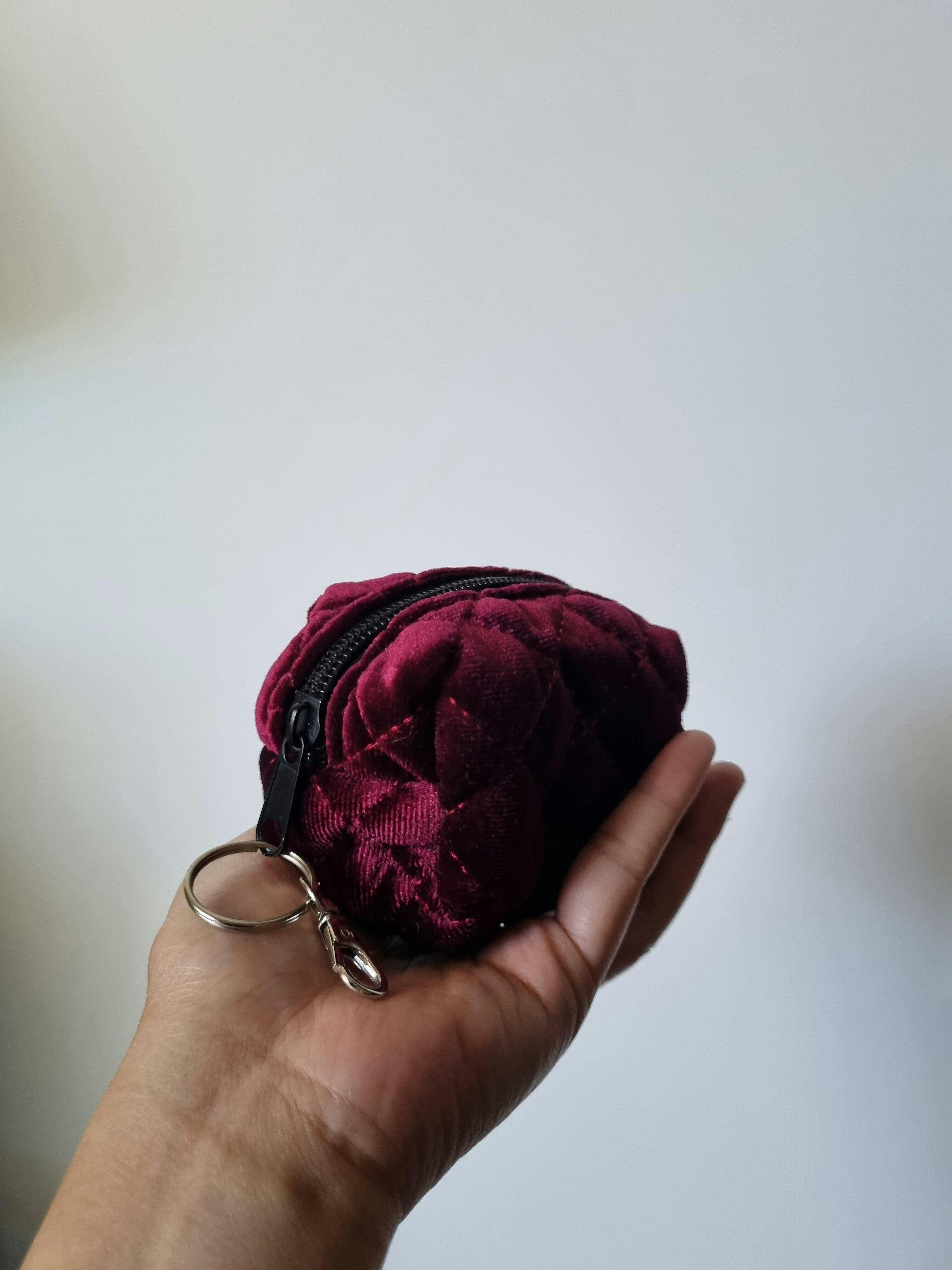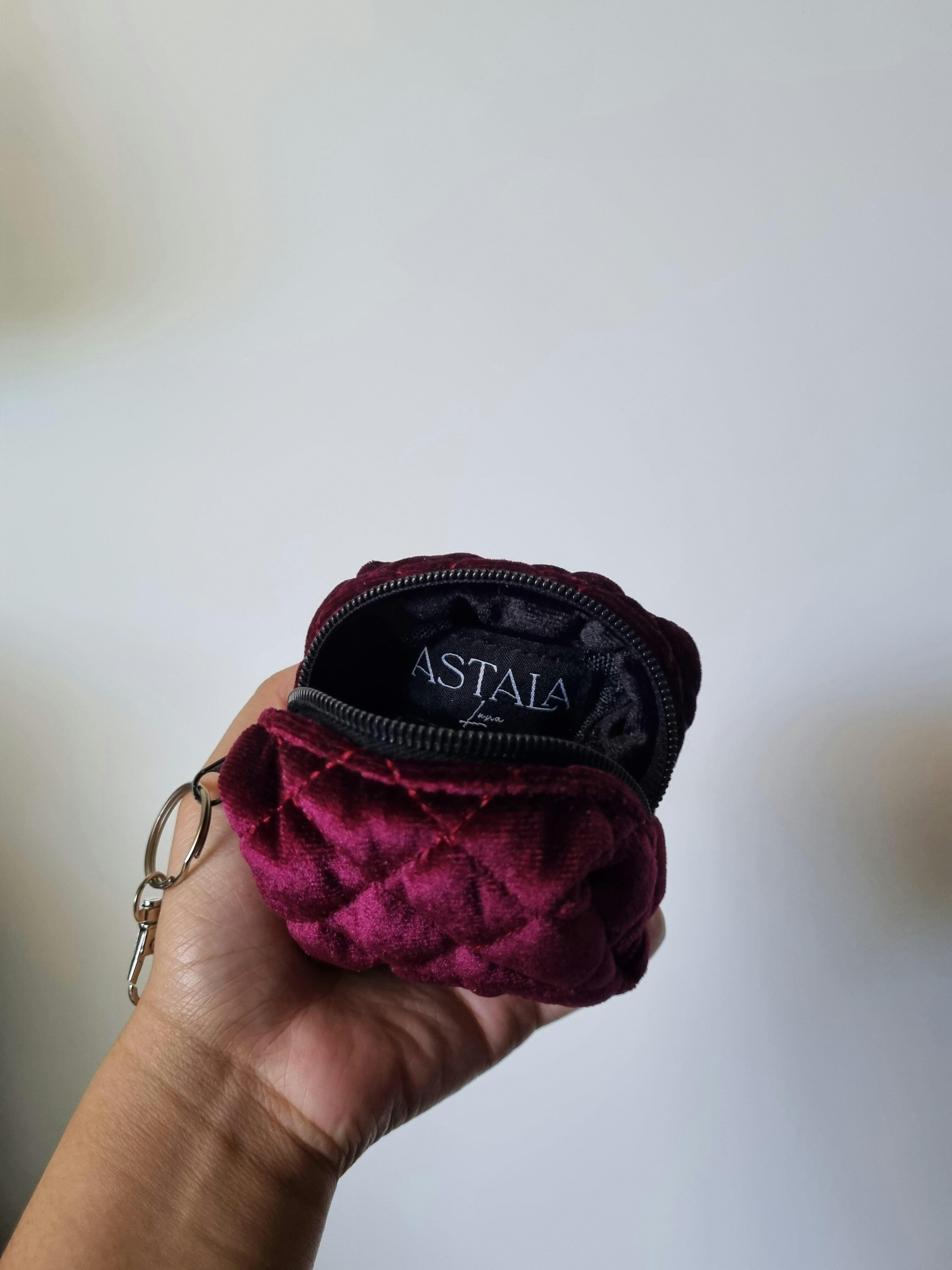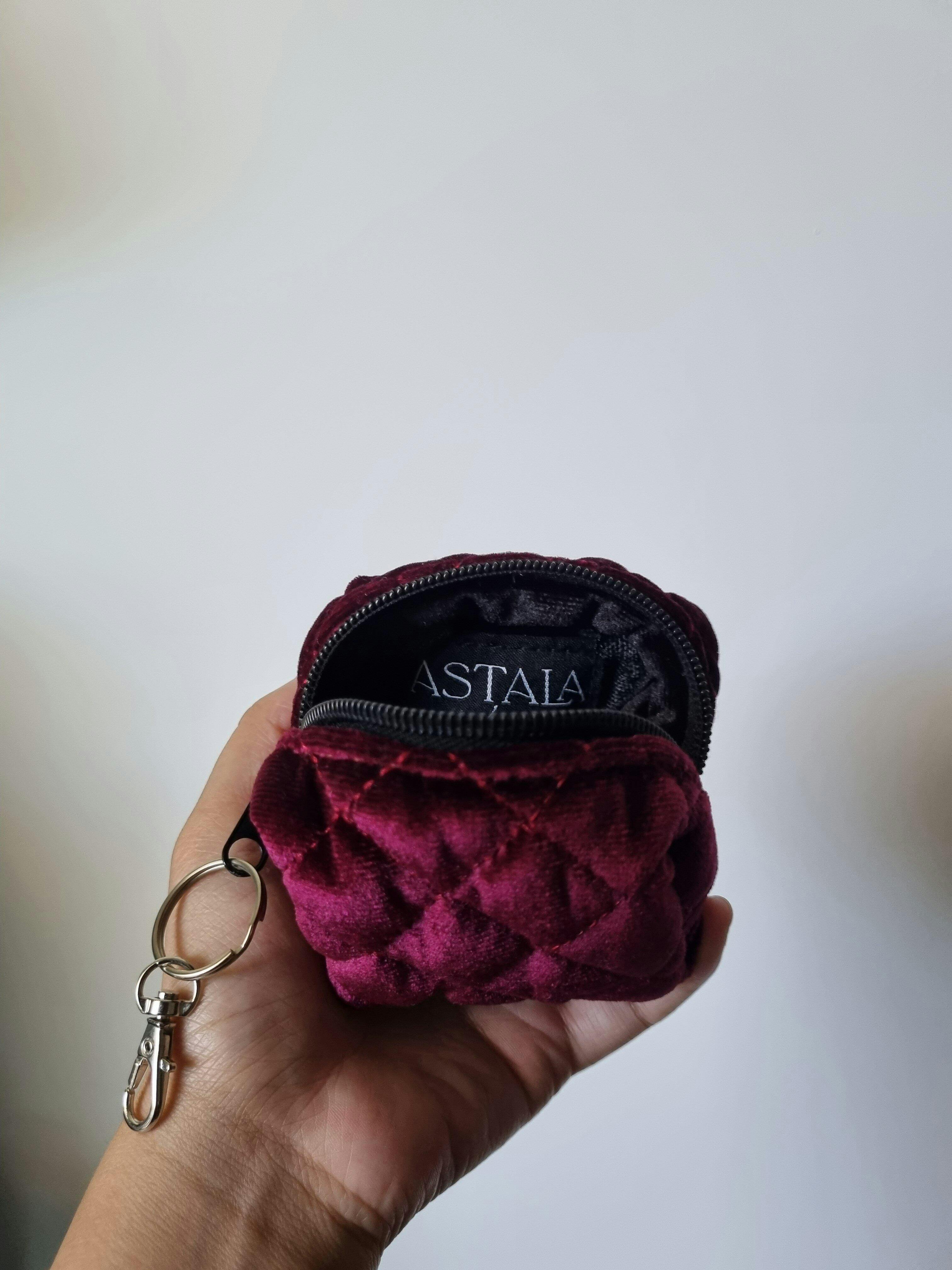 Sacred Micro Keychain is a luxury red velvet, featuring a black velvet inner lining and outer quilting. She has a luxury feel and is the cutest keychain to attach to your keys, bag or use her as a micro storage for your handbag!